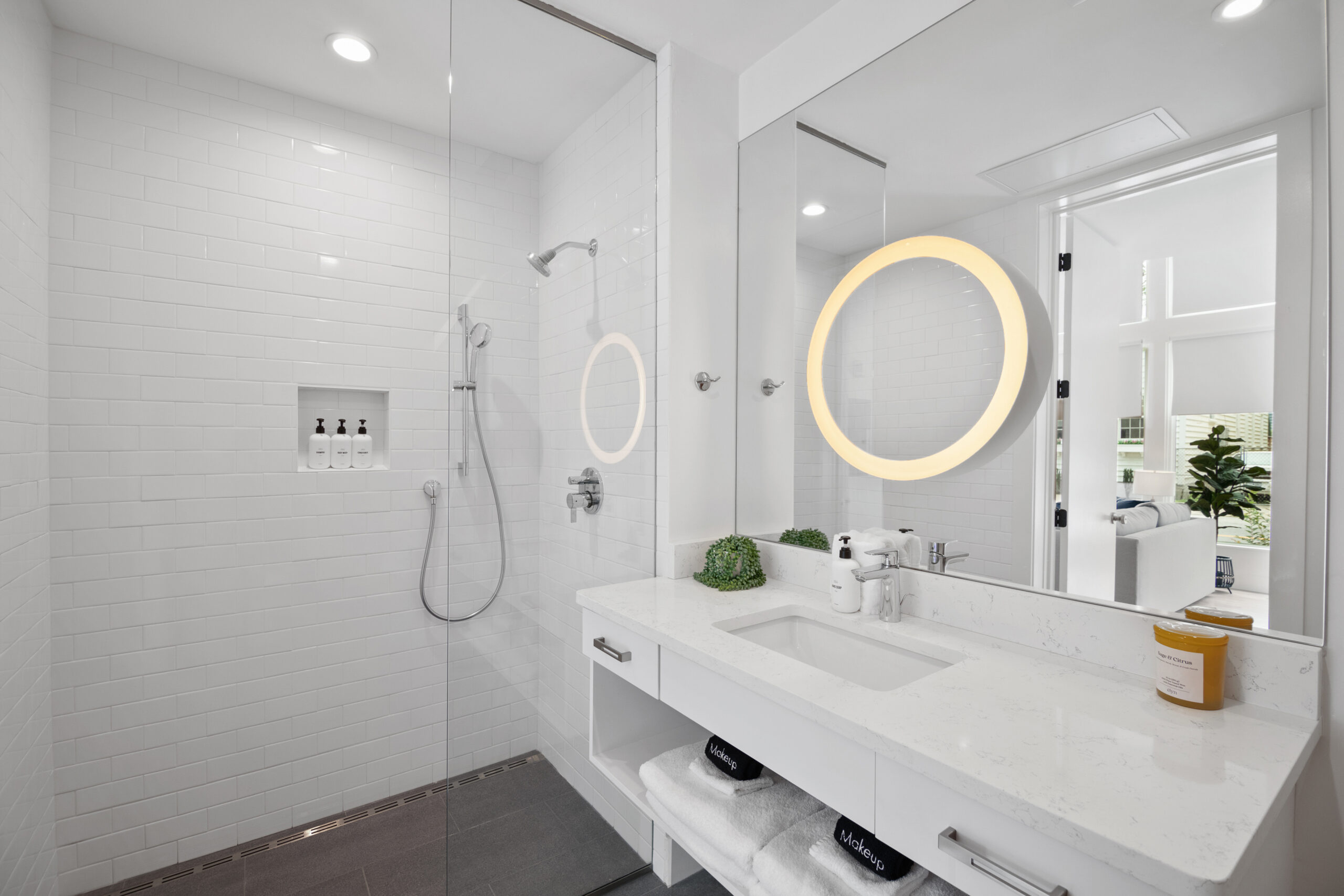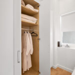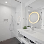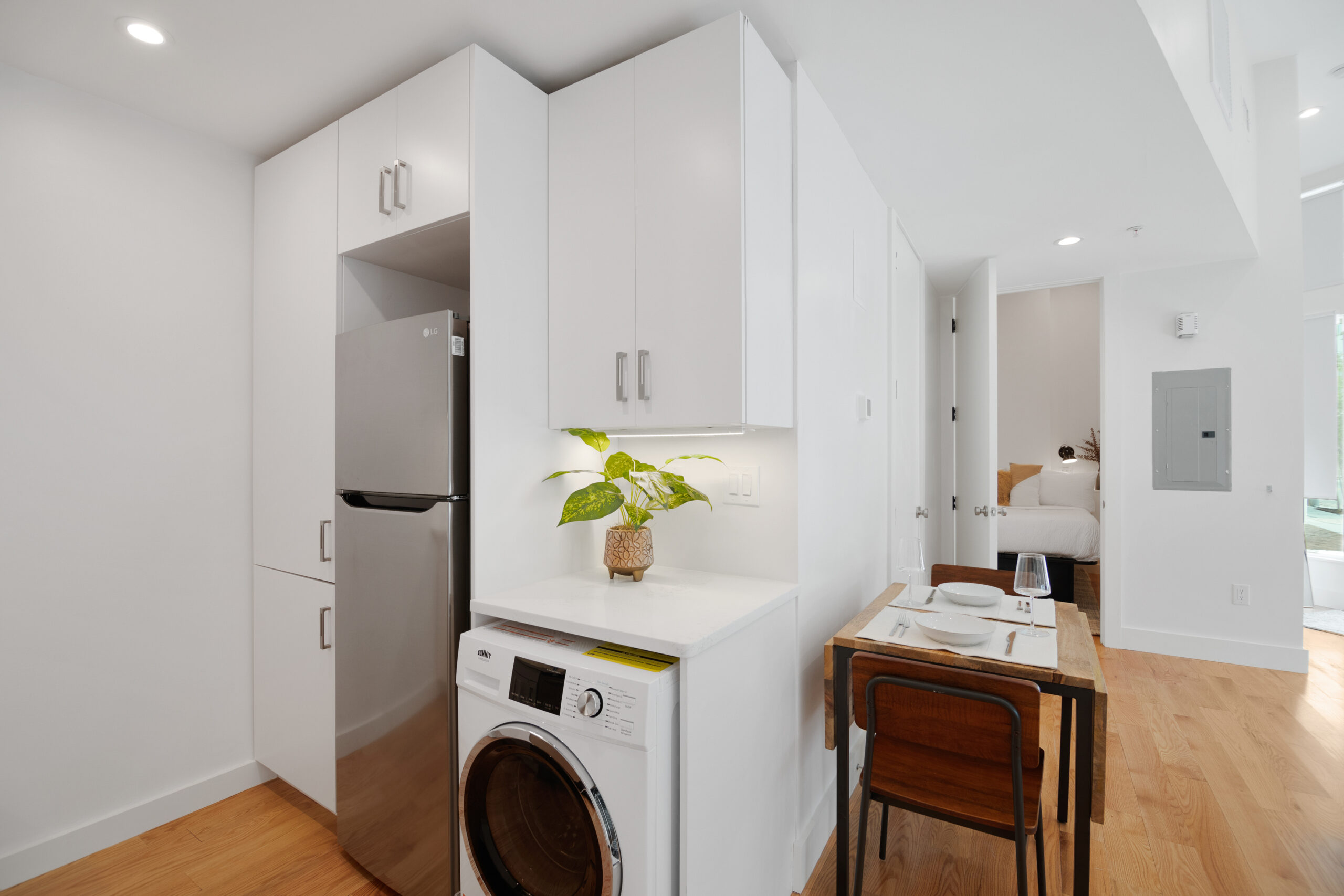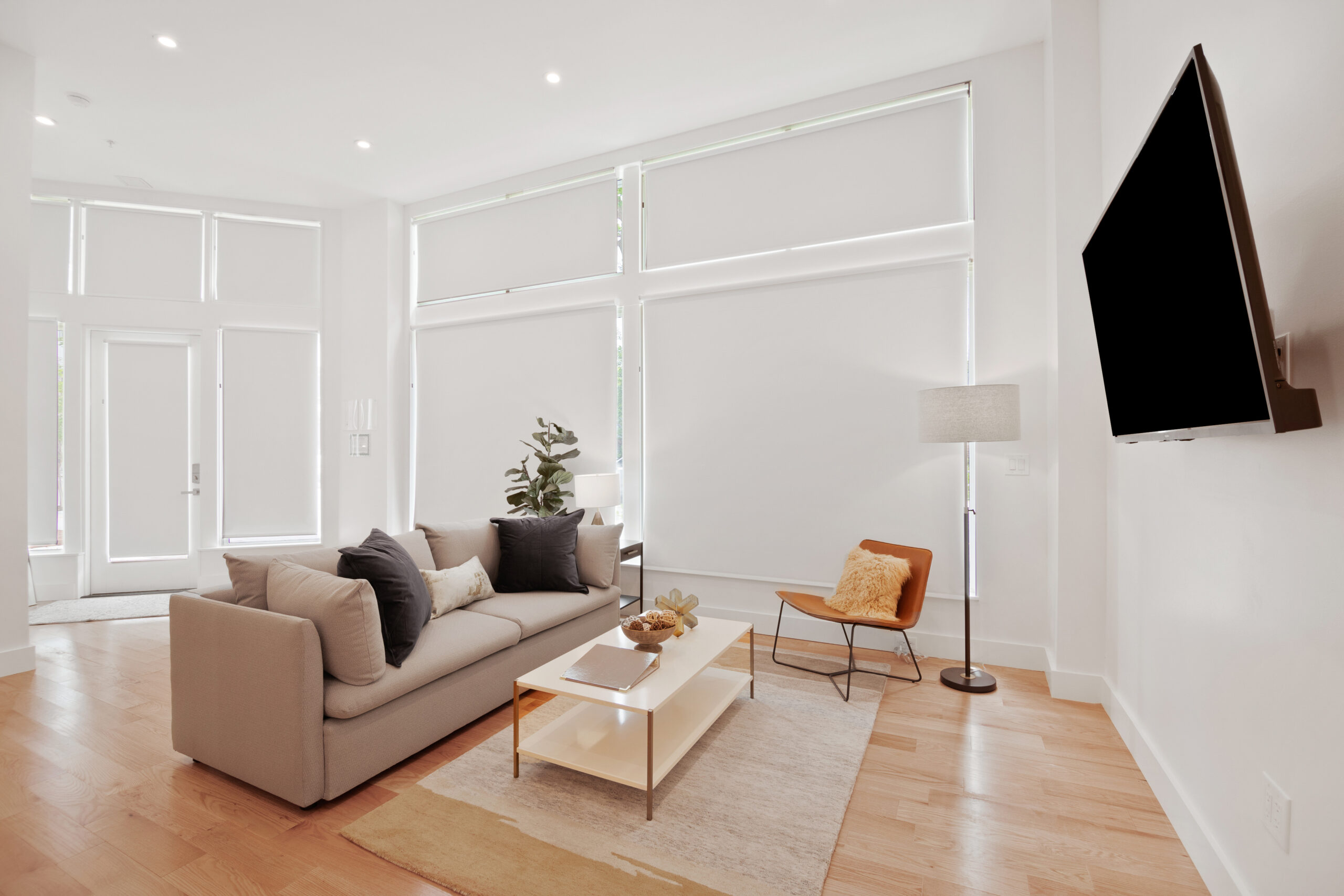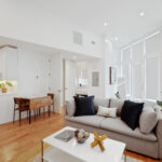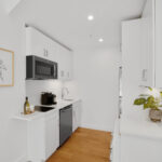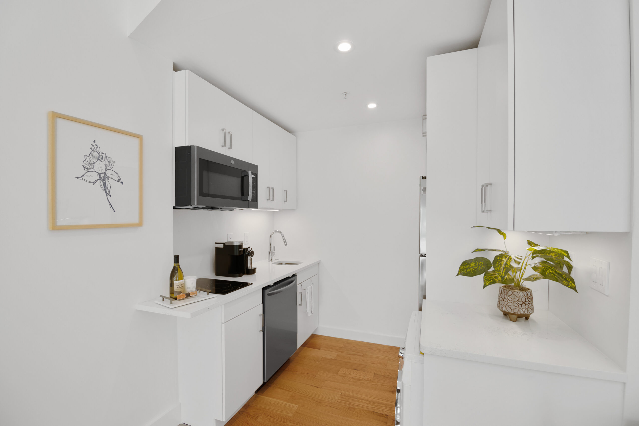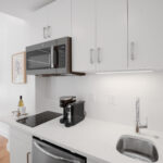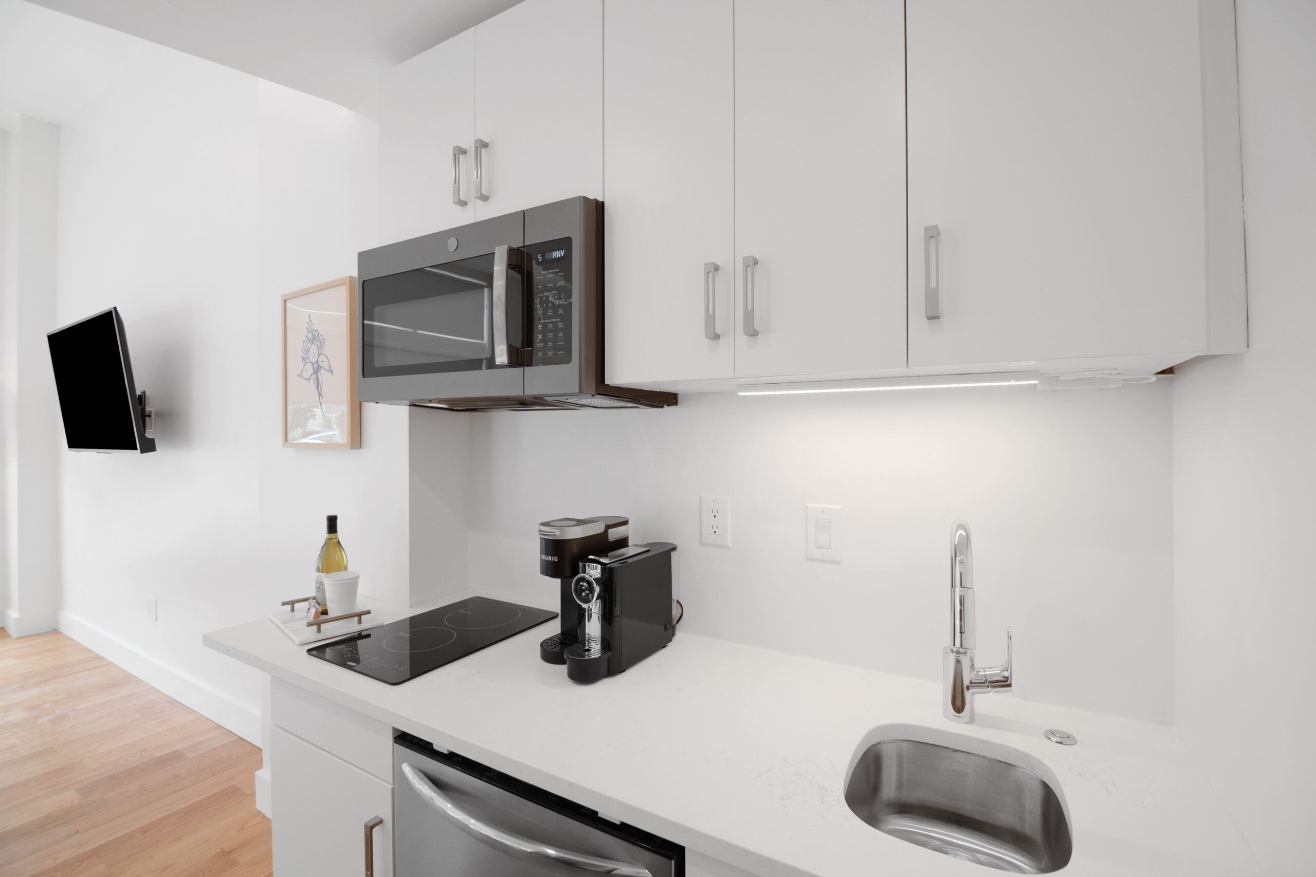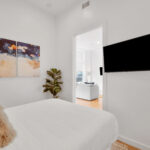 The bright living area features a queen sleeper sofa and a 55” TV. At the end of the day, the cozy bedroom is a perfect escape featuring a Casper mattress and plush linens & pillows. The full kitchen is equipped with all tools for light cooking and features an induction cooktop, full sized fridge, dishwasher, microwave, and Keurig Coffee machine. The bathroom features a spacious standing shower with double shower heads and a Philips Hue Ambiance Lighted Mirror.