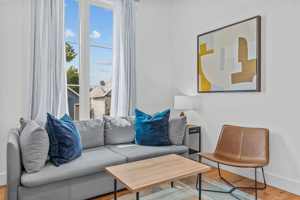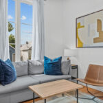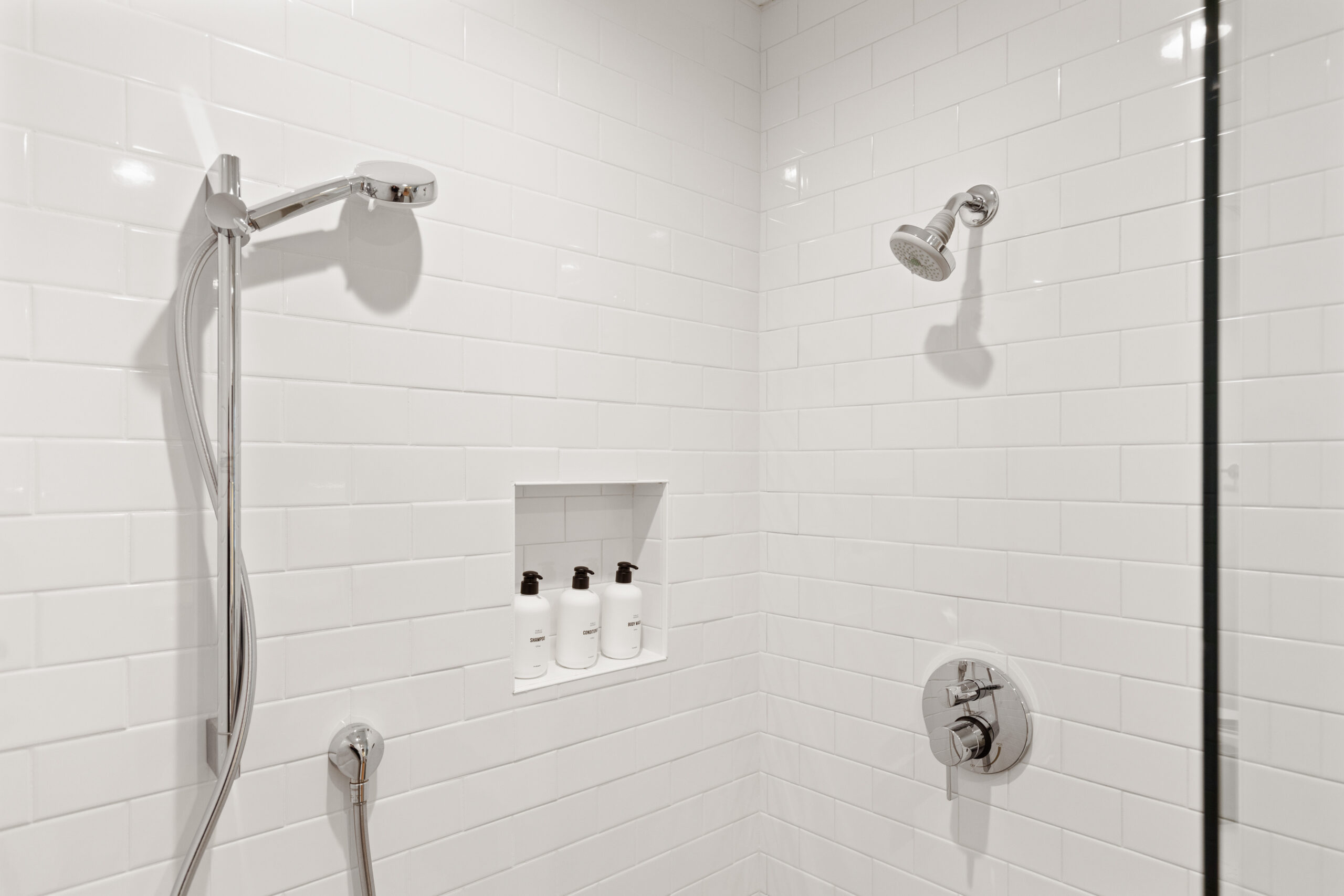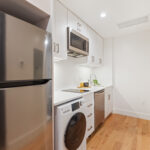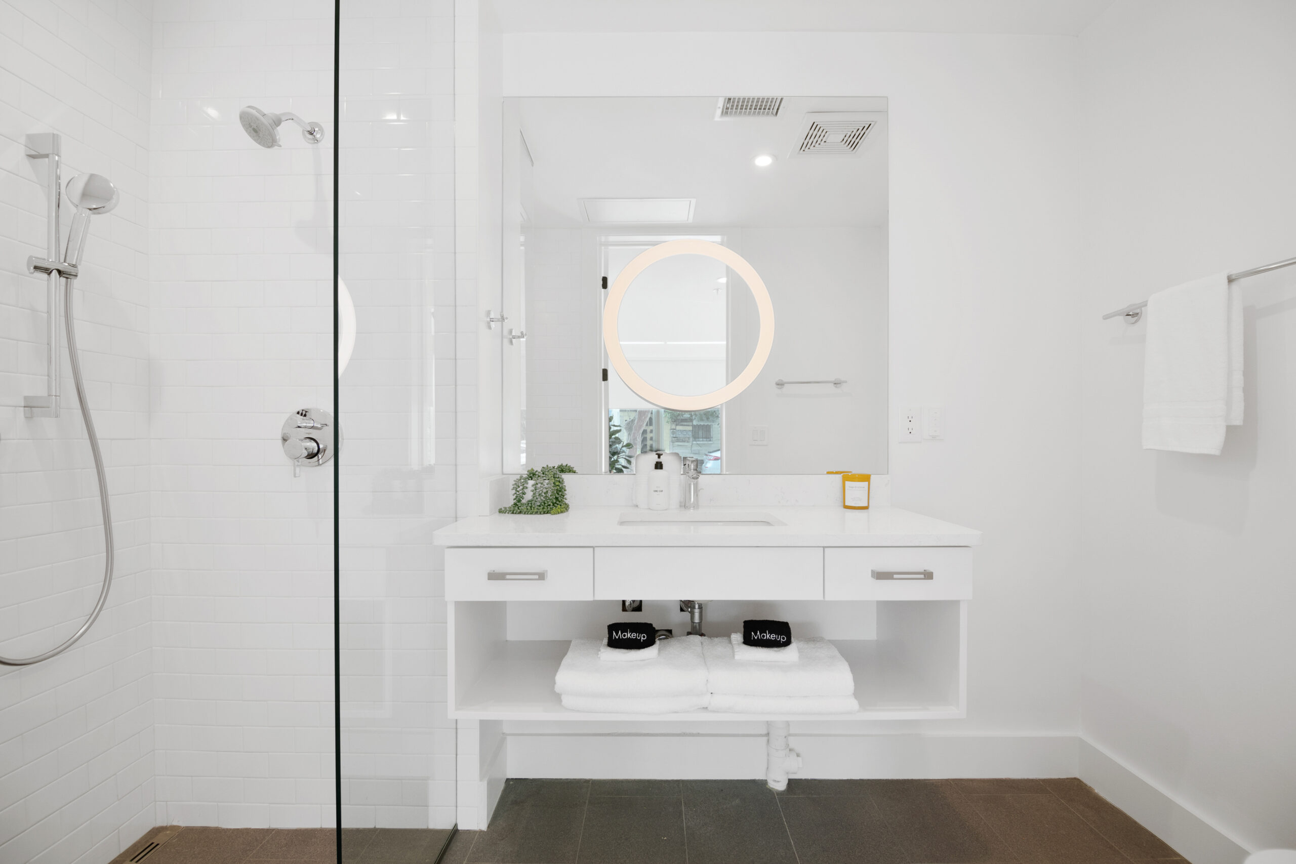 The bright living area features a queen sleeper sofa and a 55” TV. At the end of the day, the cozy bedroom is a perfect escape featuring a Casper mattress and plush linens & pillows. The full kitchen is equipped with all tools for light cooking and features an induction cooktop, full sized fridge, dishwasher, microwave, and Keurig Coffee machine. The bathroom features a spacious standing shower with double shower heads and a Philips Hue Ambiance Lighted Mirror.